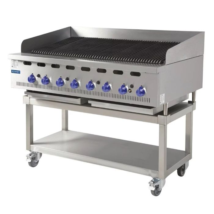 The BCB1200 Bonnet natural gas chargrill is specifically engineered for high-performance and efficiency, making it the ideal cooking solution for busy commercial kitchens. Featuring eight powerful burners spread across a spacious 1085x520mm cooking surface, this grill offers ample space for preparing steaks, skewers, and vegetables. The innovative design of the burners and grates ensures that more heat is directed towards the food, resulting in quicker cooking times and reduced heat emission in the kitchen. Cleaning and maintenance are hassle-free with the durable stainless steel construction and removable drip tray, making post-service cleanup a breeze.