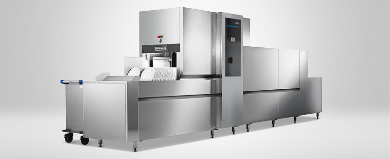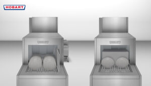 Hobart Flight type dishwashers are engineered for the rapid cleaning of large volumes of wash ware. It is crucial for these machines to maintain a well-balanced footprint and efficiency ratio.